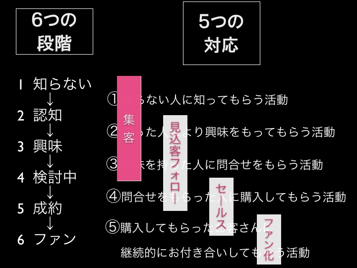 知らない人に知ってもらい、知ってもらった人に興味を持ってもらい、興味のある人から問合せをもらうまでの活動です。そういった活動なのでシンプルに考えると「集客は自己紹介」とも言えます。自社の商品の存在を知ってもらい、興味を持ってもらうために、会社に対して自己紹介をしていく活動です。