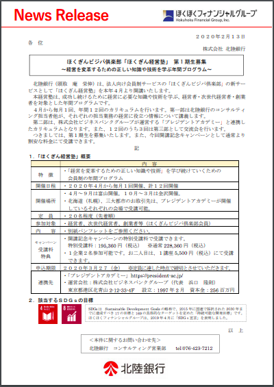 また、北陸銀行 様とは、2020年4月より北陸銀行主催の経営塾に採択されました。30社近くの経営者の皆様にご参加いただいております。