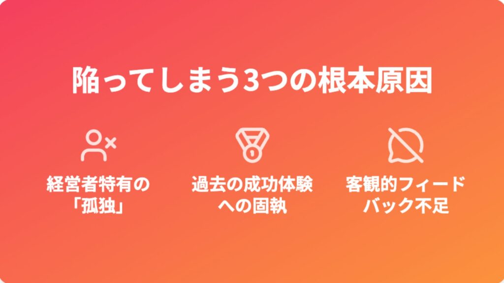 多くの特徴に当てはまってしまったとしても、それはあなた一人の能力だけの問題ではありません。経営者という立場がもたらす構造的な原因が存在します。