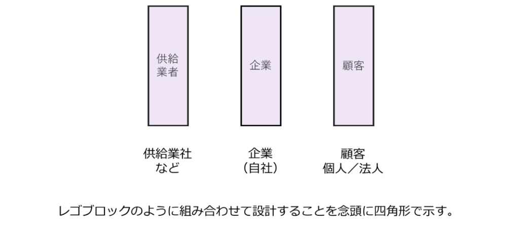 ビジネスにおいて自社を取り巻く、顧客や供給業者を長方形で表します。