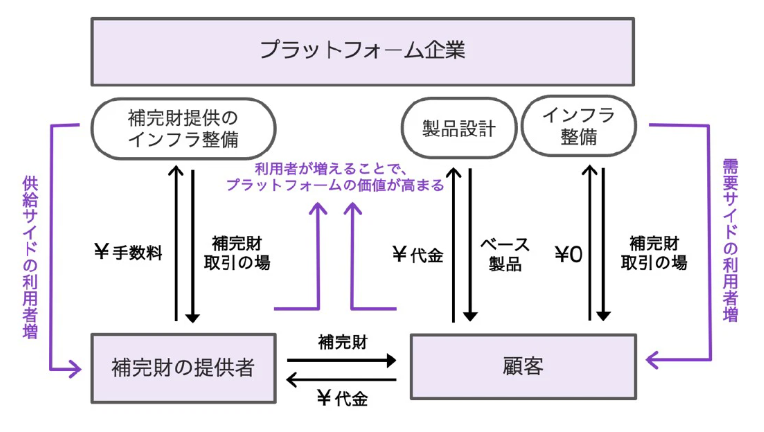 インフラを整備することによって、より多くの補完的生産者に参加してもらえば、組み合わせの価値が高まり利用者も増えるという好循環が生まれます。