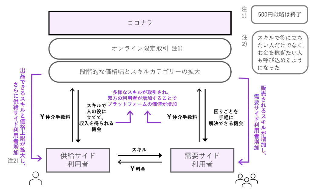 そしてサービス拡大期には、500円戦略を撤廃し、「段階的な価格幅とスキルカテゴリーの追加」の打ち手を打ちました。