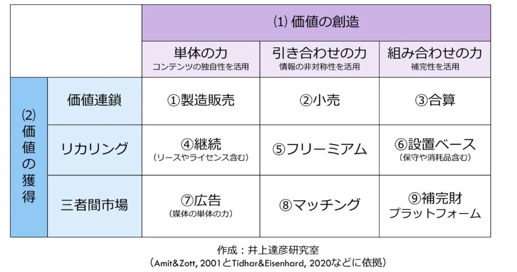 基本的な9分類—製造販売モデル、小売モデル、合算モデル、継続モデル、フリーミアムモデル、設置ベースモデル、広告モデル、マッチングモデル、補完材プラットフォームモデル—を使って、どのようなビジネスモデルでも効果的に図解できることがわかりました。
