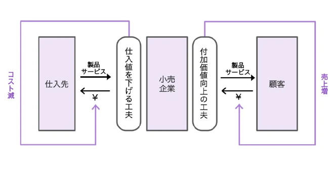 基本的に、商品そのもので違いを生み出すことはできないため、大量に購買するなどして仕入れ値を下げる一方で、付加価値を付けるなどして価格を上げる必要があります。