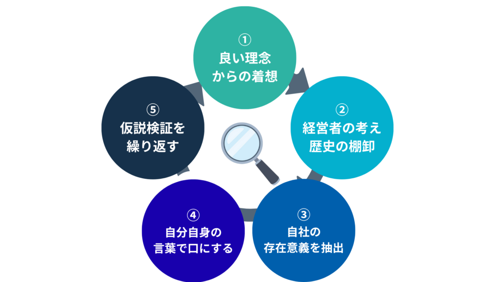 それでは、実際にどのようにして「良い経営理念」を作ればよいのでしょうか。周囲を巻き込みながら、顧客の心を動かし、磨き上げるための5つのステップを紹介します。