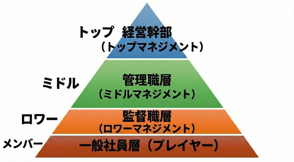 | ミドル | 管理職層(ミドルマネジメント) | ・部長 ・課長 ・マネージャー | 【管理職】 決定された戦略を実行し、 部門目標を達成する |