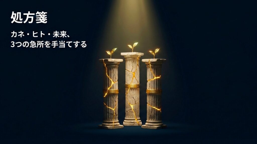 診断結果で「No」が多かったカテゴリーは、あなたの会社の「伸びしろ」であり、今すぐ手を打つべき急所です。 「精神論」ではなく、明日から導入できる「具体的な仕組み」と「運用ルール」として解決策を提示します。