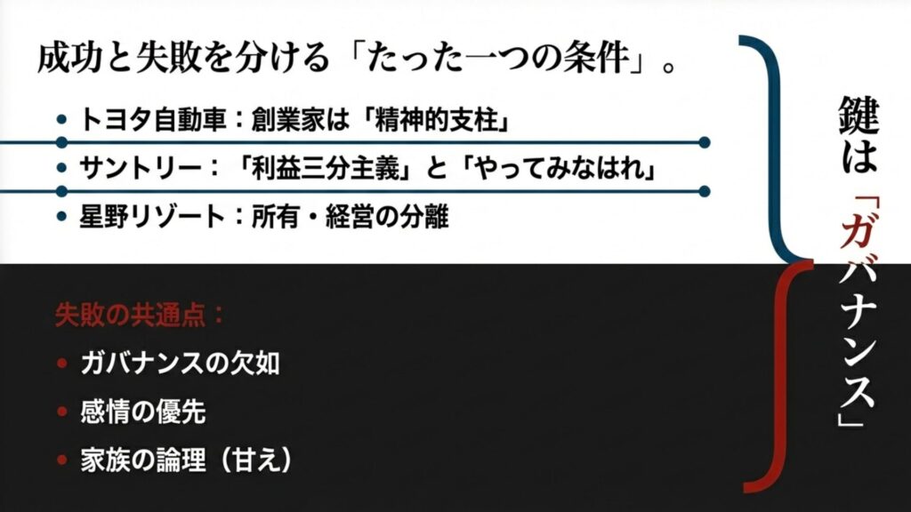 失敗する企業と、トヨタやサントリーのように世界的な成功を収める企業の差は、「同族であること」自体ではなく、「ガバナンス(規律)」の有無にあります。
