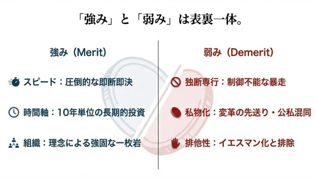結論: メリットとデメリットは別物ではありません。「強いリーダーシップ」というコインの裏側が「独裁」なのです。成功企業は、このコインが裏返らないように、意識的に「ガバナンス」という留め金をかけています。