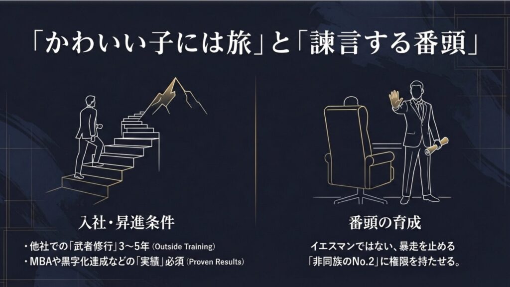 自社以外の釜の飯を食わせます。できれば厳しい環境で、中間管理職としての苦労を経験させ、一定の評価(昇進など)を得てから戻すことを条件にします。