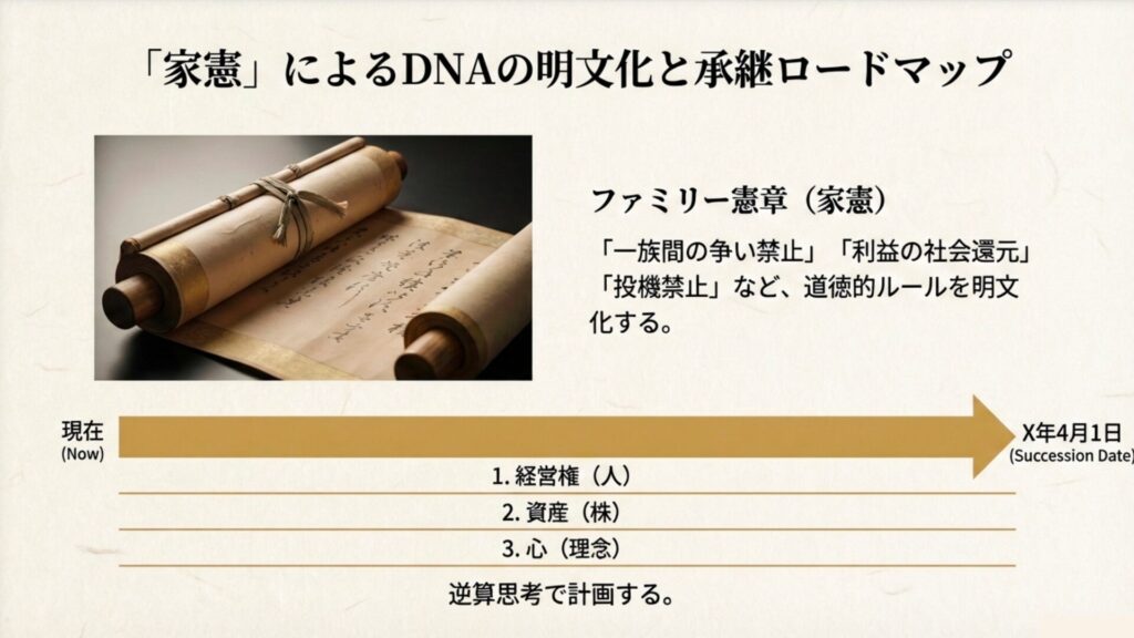 定款(法律)とは別に、一族が守るべき「道徳的ルール」を明文化します。これは判断に迷った時の「憲法」となり、世代を超えて理念を継承するアンカー(錨)となります。
