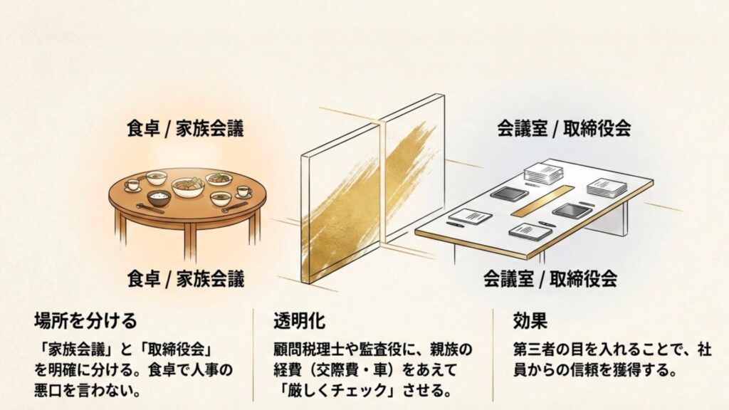 多くの同族企業で公私混同が起きる原因は、「食卓(プライベート)」で「経営(ビジネス)」を決めてしまうからです。これを物理的に分けるだけで、驚くほど透明性は上がります。