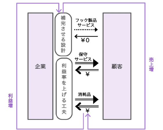 本体を渡す矢印は細く、消耗品・保守料が返ってくる矢印は太い。この非対称こそが、ジレットモデルの収益構造をそのまま表しています。