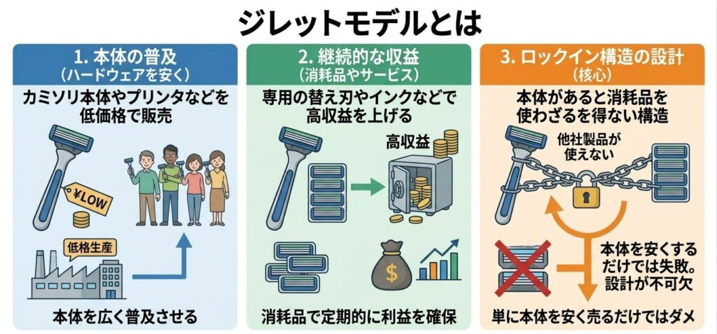 ジレットモデルとは、「本体(ハードウェア)を安く普及させ、それに付随する消耗品や保守サービスで継続的に利益を上げる」ビジネスモデルです。