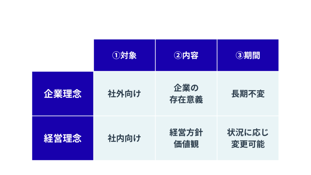 企業理念は「社外に示す永続的な存在意義」、経営理念は「社内に示す柔軟な経営指針」という違いがあります。