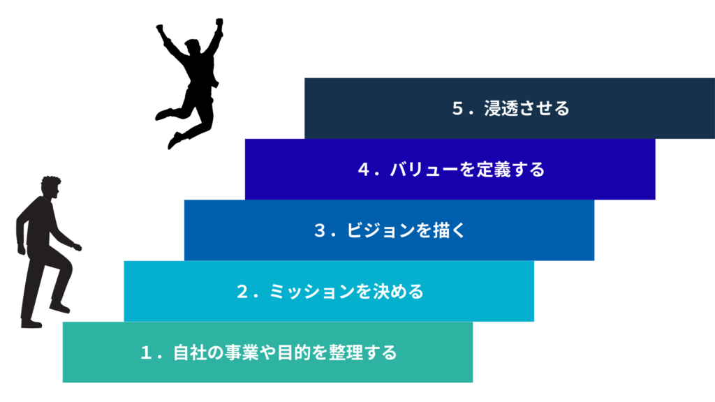 ここまでで、MVVの違いとその内容について、その具体例とともに紹介してきました。しかし、ただ、違いを理解して終わりではありません。今回学んだ内容をもとに、実際にMVVを策定あるいは改修し、自社の中で実行してこそ意味があるのです。ここからは、MVVの策定から実行までの5ステップを紹介していきます。