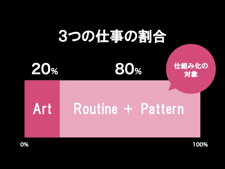 まず、自身が日々行っている業務を全て書き出します。そして、それらを「Art(感覚型:自分にしかできない創造的な仕事)」「Routine(単純型:手順が決まっている単純作業)」「Pattern(選択型:いくつかの選択肢から選ぶ定型業務)」に分類します。