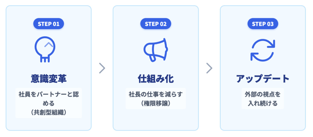 本記事では、ワンマン経営から脱却し、持続可能な組織を構築するための具体的な3つのステップを解説しました。