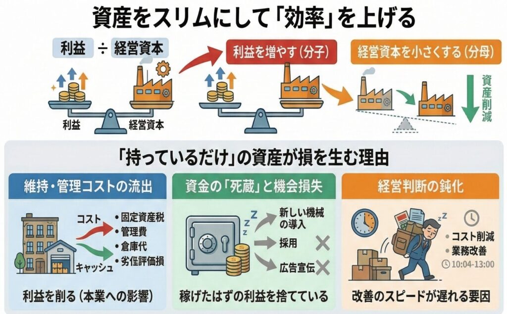 経営効率を高めるためには、利益(分子)を増やすだけでなく、経営資本(分母)を小さくするという視点を持つことも必要です。