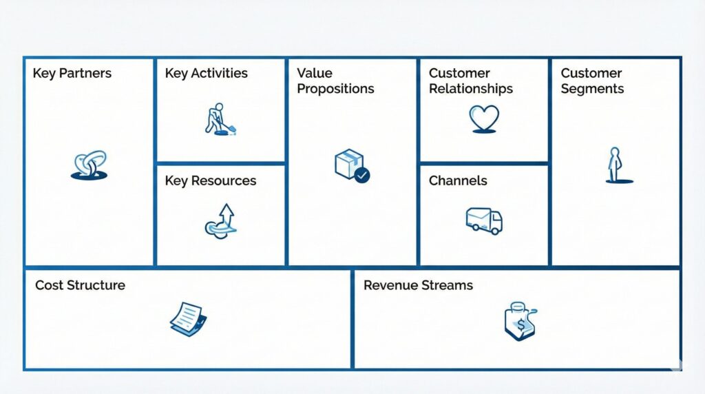 この全体像を把握するためには、「ビジネスモデル・キャンバス」などのフレームワークを活用するのが有効です。