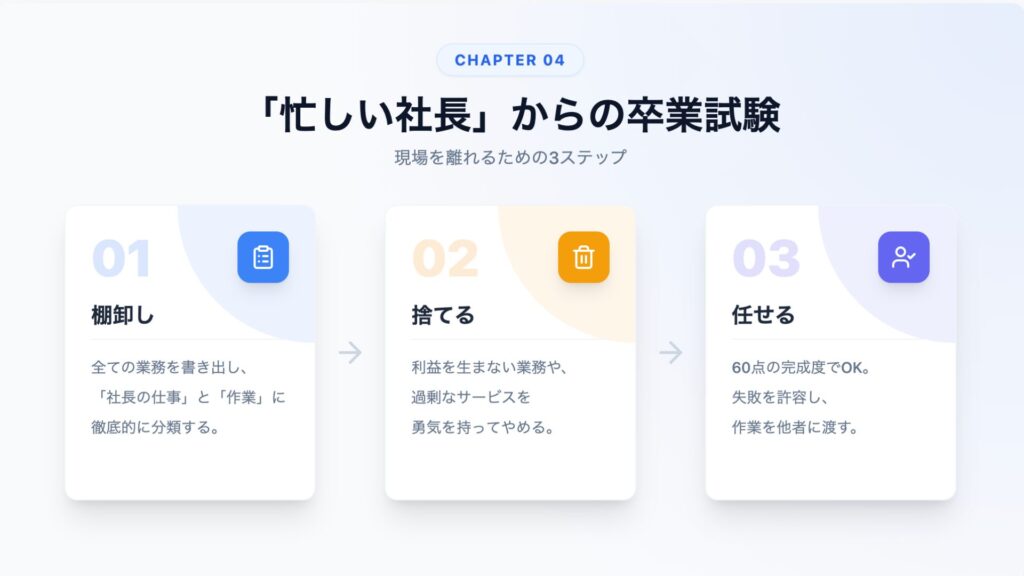 4. 「忙しい社長」を卒業しよう。あなたが現場を離れることこそが、最強の解決策だ