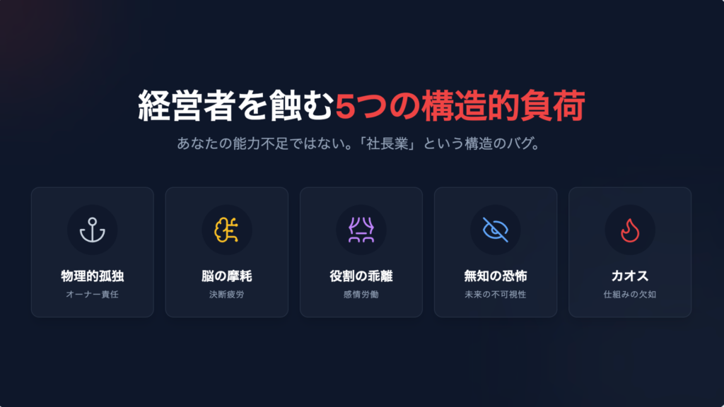 「なぜこんなに苦しいのか」の原因が分からないことが、余計に不安を煽ります。経営者のストレスは複雑に絡み合っていますが、分解すれば以下の5つの「構造的な負荷」に集約されます。これらは、あなたが無能だから起きるのではなく、社長業という構造上、必然的に発生するものなのです。