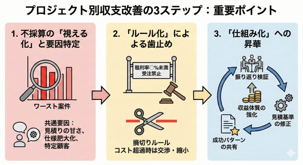 「見積もりの甘さ」「度重なる仕様変更」「値引き要求の強さ」など、不採算案件に共通する要因を特定します。
