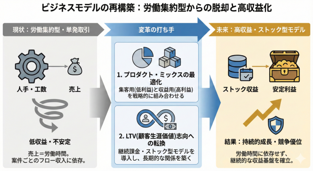 目先のコスト削減や単価交渉だけでなく、商品やサービスの「売り方」そのものを設計し直すことで、収益構造は根本から改善されます。