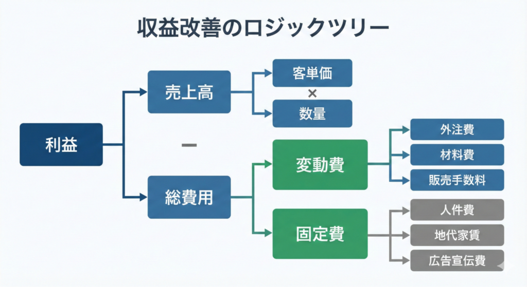 利益は「売上」「変動費」「固定費」という要素で構成されています。これらを細分化することで、改善すべき優先順位が明確になります。