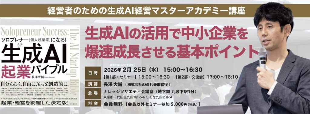 | タイトル | 経営者のための生成AI経営マスターアカデミー講座 生成AIの活用で中小企業を爆速成長させる基本ポイント |